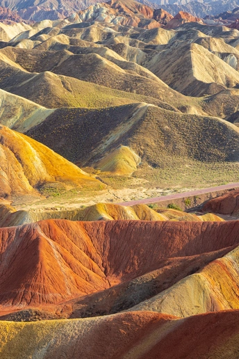 张掖丹霞地貌,是大自然的神来之笔。那起伏的山峦似多彩的画卷,红如烈火,黄若鎏金,白像瑞雪。斑斓色彩在阳光照耀下闪耀夺目,如梦幻世界。彩色丘陵与蓝天相映成趣,每一帧画面都美到极致,让人流连忘返,赞叹大自然的鬼斧神工。