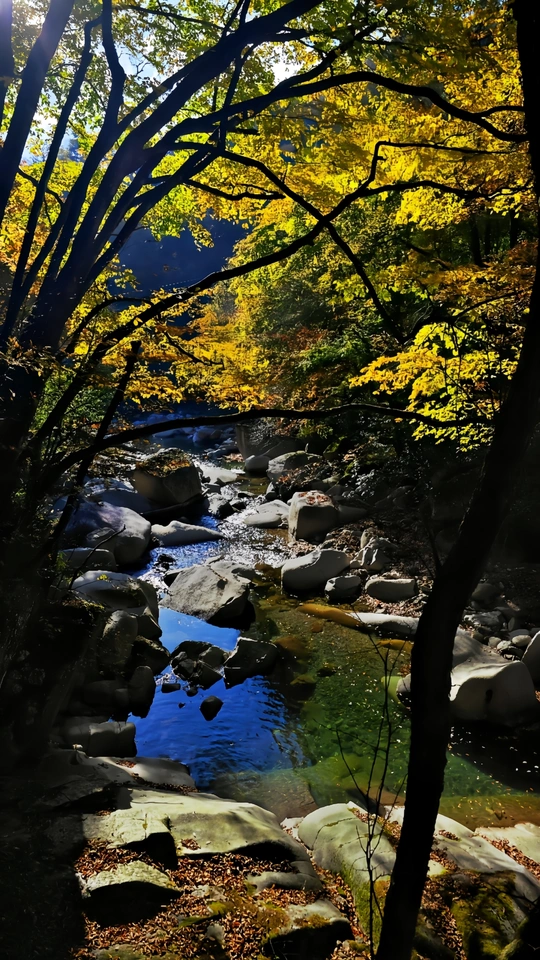 ☀️作品采集 在山涧小道行进之时,忽然发现旁边小溪有这一局部景象,随下到溪间留下痕迹。 🌞作品陈述 在秋意渐浓的林荫间,缓缓流动的小溪清澈泛绿,光影的注入更加充满了风光惬意,明暗的对比,层次感十足。 🌝总结 自从学习了摄影,养成了一种习惯,走到哪都习惯性的环周边张望,也开启了读意境的思维。