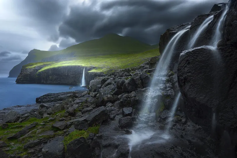 这是法罗群岛众多坠海瀑布的又一个,也是这次探索到的新点。前后多层瀑布的组合挺有意思,前景的小瀑布只有在连续降雨后才会出现,当我第二次去时天气太晴反而没有水了