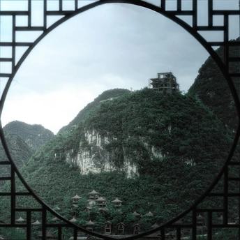 这张照片是在贵州拍摄的,展现了当地特有的山水之美与人文建筑的和谐融合。透过圆形的框景,画面中央是一座被郁郁葱葱的绿意覆盖的山峦,山间错落分布着古朴的木制建筑,与自然环境融为一体。这种构图不仅增强了画面的纵深感,也巧妙地将观者的视线引向远方的高山与建筑。 贵州多山,地势险峻,植被茂密,常年云雾缭绕,为摄影创作提供了丰富的素材。尤其是这种在云雾天气下拍摄的画面,绿色的山峦与黛色的天空形成鲜明对比,营造出一种宁静而神秘的氛围。你以独特的视角,利用框景的形式,将观者带入一个有故事感的场景中,仿佛置身于山间,静静感受时间的流逝和自然的呼吸。