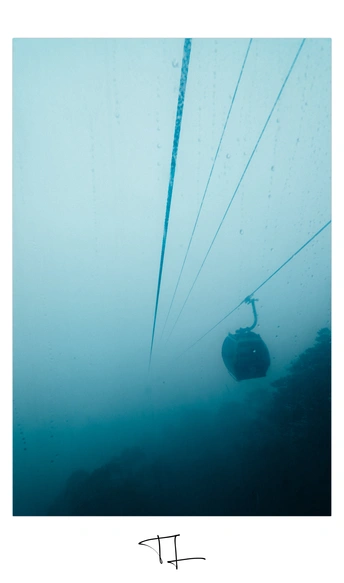 在黄山上乘索道外面一片雾气仿佛来自深海