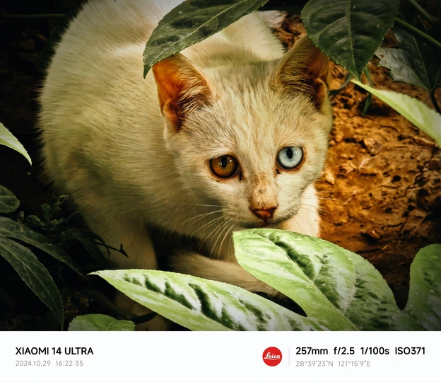 藏匿于隐秘草丛中的独特异瞳小白给人一种神秘的感觉