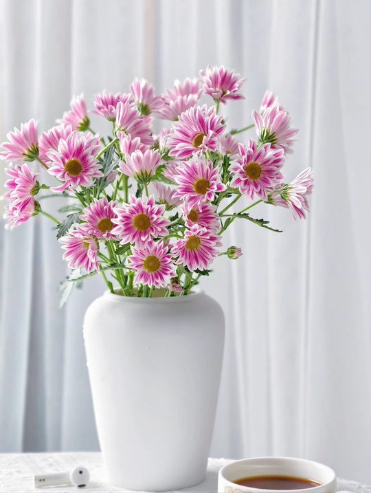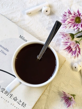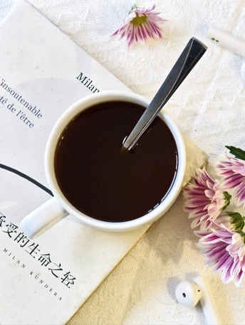 灰蒙蒙的天气,来一杯咖啡提提神,几朵小花加点色彩。