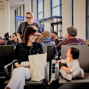 洛杉矶机场候机大厅,两岁出头的小宝,看到旁边的女士已经注视到了自己,不管是否相识,不论语言是否相通,直接通过表情、手势和几个英语单词,就与对方“攀谈”起来,引得女士吃惊不已,高兴不已。
