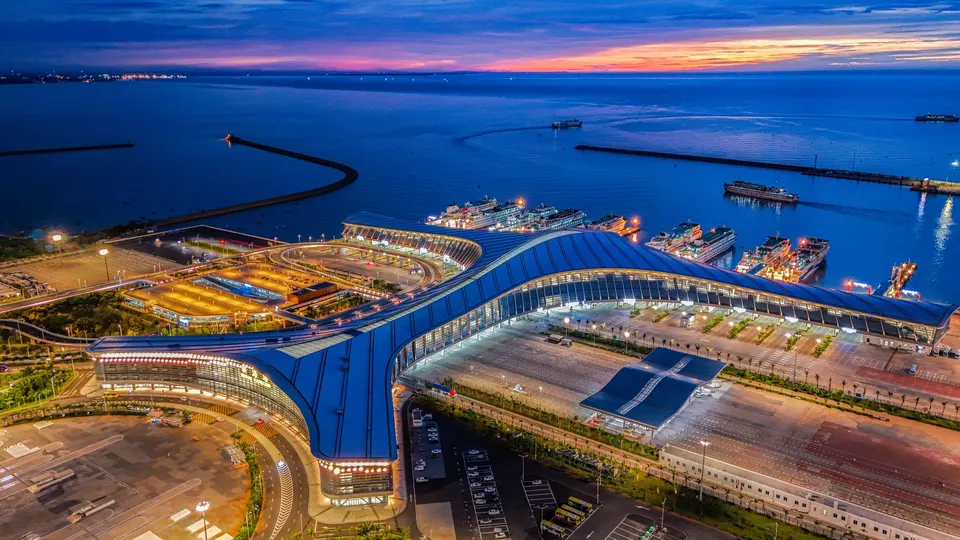 太阳下山了,航拍蓝色时刻下的海口新海港码头