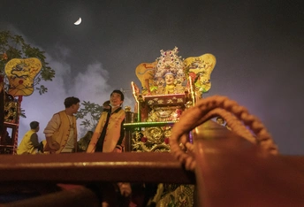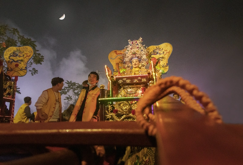 抬神架的大叔与神像仿佛邻里街坊茶余饭后散步时的谈笑风生,十分有趣。