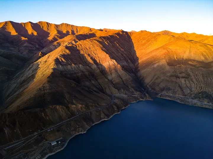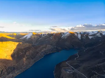 满拉水库位于西藏日喀则地区江孜县龙马乡境内,那可是一片宛如仙境的存在。站在水库边,首先映入眼帘的就是那一汪湛蓝湛蓝的湖水,就像一块巨大无比的蓝色宝石镶嵌在大地之上,在阳光的照耀下,波光粼粼,闪耀着迷人的光芒,简直美到让人窒息。它的四周环绕着连绵起伏的山脉,那些山峰有的高耸入云,山顶上还终年积雪不化,白色的雪与蓝色的湖水相互映衬,构成了一幅绝美的画卷,仿佛是大自然这位顶级画家精心创作的杰作。