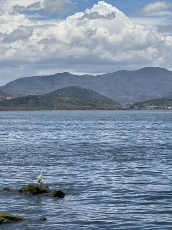 这幅作品的核心主体是一只白鹭,它站立在洱海湖心的礁石之上。白鹭姿态优雅,在广阔的洱海背景衬托下显得格外醒目。它或许正在休憩,又或许在观察水中的猎物,修长的脖颈和亭亭玉立的身姿展现出它的灵动之美。 洱海作为背景,水面波光粼粼。湖水的颜色可以是宁静的蓝色或带有天空映照的浅蓝色,根据拍摄时的天气和时间而不同。湖心的礁石增加了画面的层次感,它的形状和质地与柔顺的湖水、轻盈的白鹭形成对比。