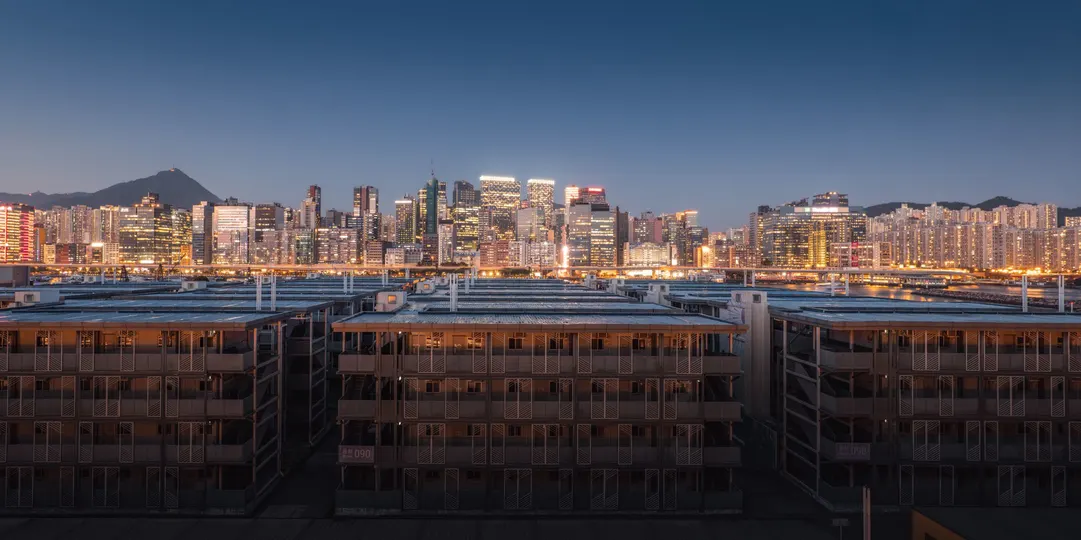 比起风光摄影中较为常见的古今同框的题材,方舱医院与城市天际线相结合的画面似乎更具有时代特征与社会意义。疫情期间,政府为集中收治轻症患者、释放医疗资源并控制疫情传播,建设了许多方舱医院。如今疫情过去,各地的方舱医院陆续拆除,而我在香港看到了荒废无人的方舱医院与热闹繁华的城市群相结合的场景,于是我用相机记录下了这个可能随时消失在时间浪潮中的同框画面,一方面能让我们牢记抗疫时期的艰难,一方面能让我们更懂得珍惜如今美好安定的生活。 这套组图前景皆为启德方舱医院,后景为观塘城市群。画面下方的方舱寓意政府作为基石支撑着上方代表经济、民生、社会的城市群。建设方舱医院是我国应对疫情的积极举措,也体现了我国始终坚持以人民为中心的发展思想。前景的方舱医院呈冷调和暗调为营造疫情已过、医院废弃的荒凉感,后景的城市群呈暖调和亮调寓意时代翻篇、经济复苏、百姓安居乐业、国泰民安……