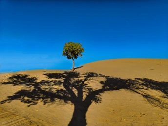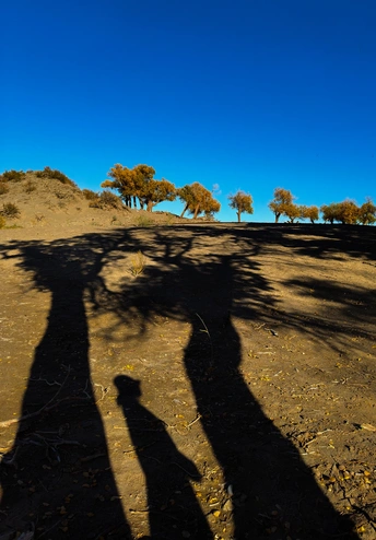 黄昏的阳光洒在这片空旷的土地上,天地间仿佛被时光凝固成了一幅静谧的画卷。湛蓝的天空像是一片深邃的海洋,将人的心灵吸引到遥远的地方。几株高大的树木孤独地矗立在地平线上,枝叶微微泛黄,仿佛是在向这个季节诉说着古老的秘密。树影在地面上延展,如同一只巨大而温柔的手,轻轻触碰着大地,给荒凉的土地添上了一层温暖的守护。 我的影子被拉得细长,静静地融入这片树影的怀抱中,像是一个孤独的旅人,与这片土地达成了一种默契的交流。我仿佛能听见风拂过树叶的细语,像是它们在低声诉说流转的岁月,诉说曾经的繁华和未来的希望。这一刻,所有的喧嚣都消失了,留下的是内心的宁静与自然的回响。站在这片土地上,我不再是自己,而成了天地间一缕微小的尘埃,与万物共呼吸、共沉默,感受着生命的无穷延展和轮回。