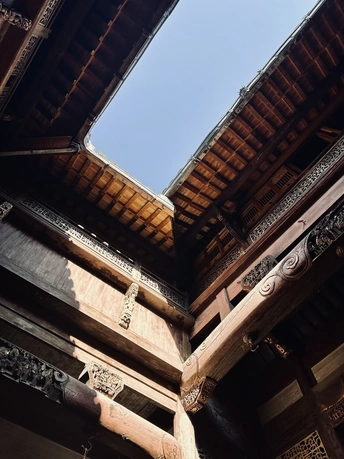 安徽宏村的老楼,阳光透过屋檐照射下来,照亮这历经百年历史的房梁