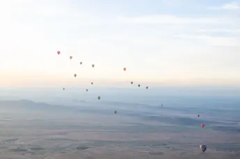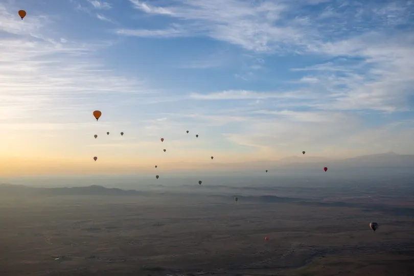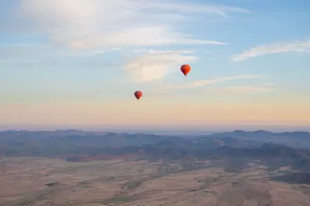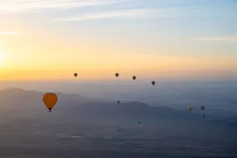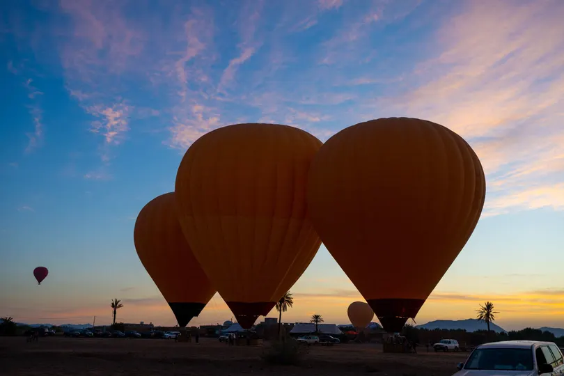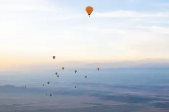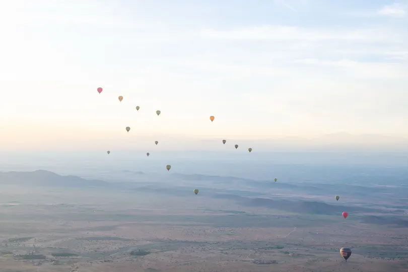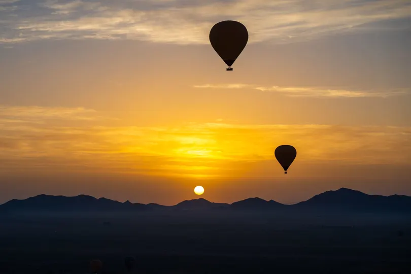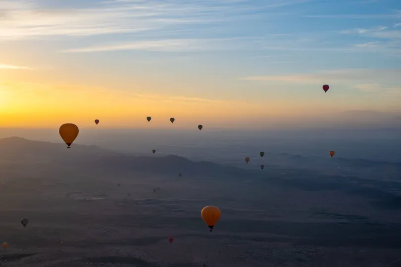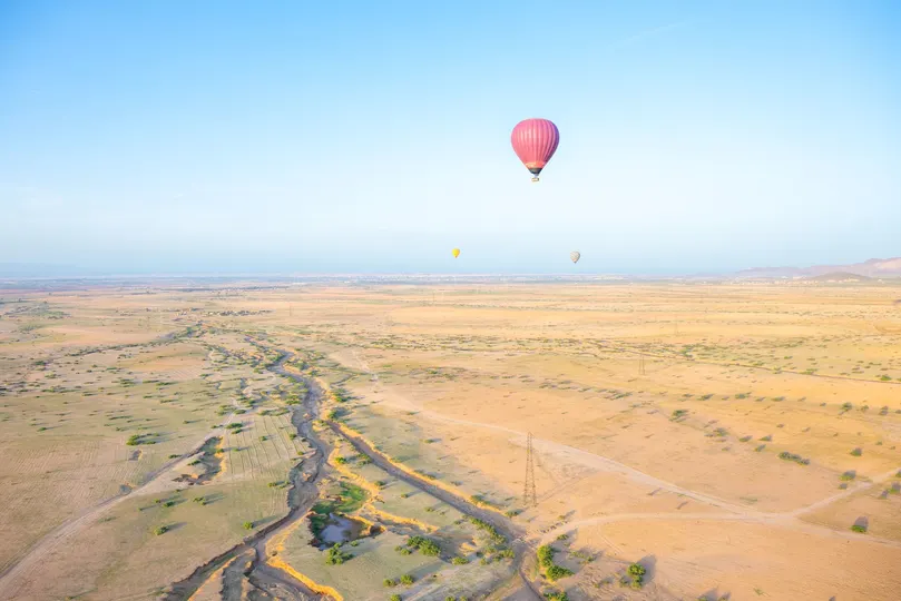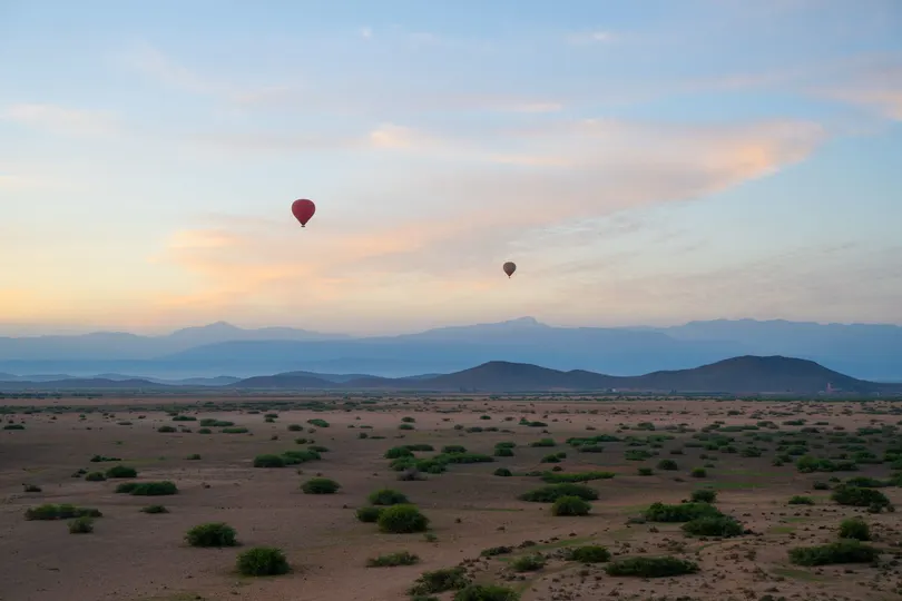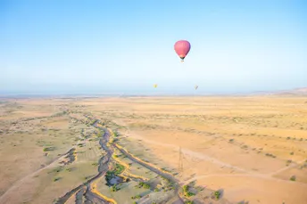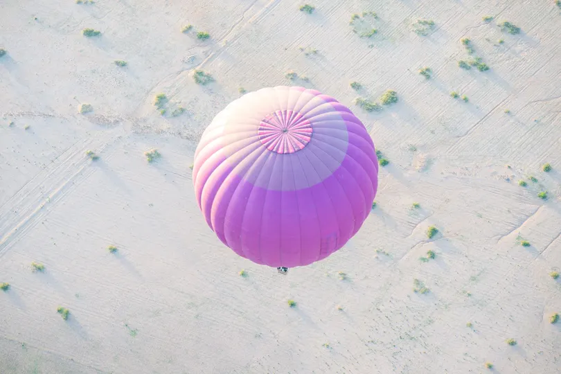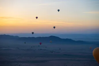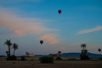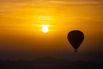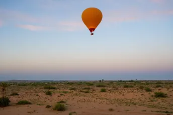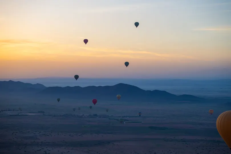 一片荒凉,沙粒悄然沉睡, 暗黄的地平线,轻轻喘息。 热气球浮起,轻盈如梦, 在日出的温柔里缓缓升腾。 橙与粉的微光,洒满天边, 每一缕晨曦,都是新生的吻。 它穿过静默的沙丘, 似乎不忍惊扰这古老的安宁。 无垠的荒漠,迎来一天的心跳, 而那朴素的风景,融化在晨光里, 在天空的怀抱中, 带着我们的渴望飞向远方。