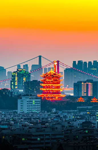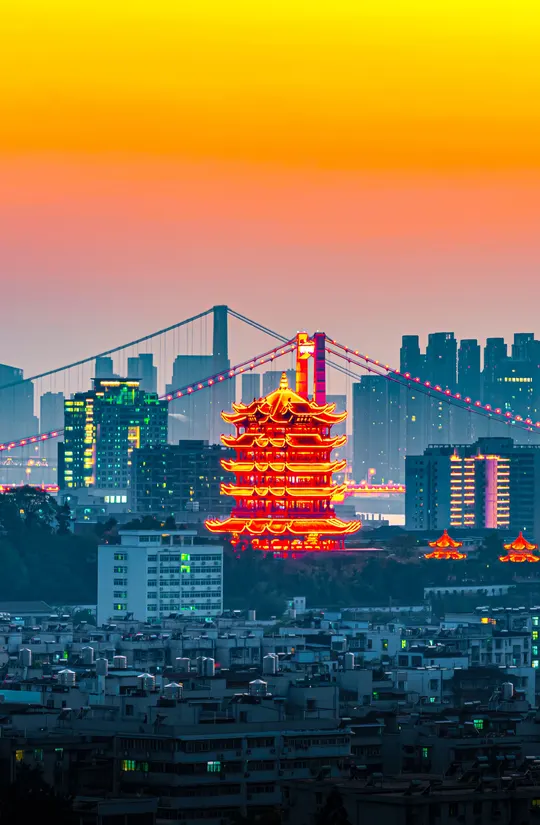 黄鹤楼华灯初上,远处鹦鹉洲大桥和杨泗港大桥与之遥相呼应,夕阳西下,一副中式古典美学景色呈现!