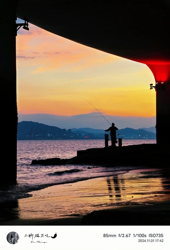 傍晚,沐浴在余晖中的海上大桥壮丽如史诗。 前方桥下的钓鱼人,寻一湾碧水,觅一处幽静,享受难得的悠闲,痴迷自由自在的喜欢。 一杆一世界,一漂一浮生。