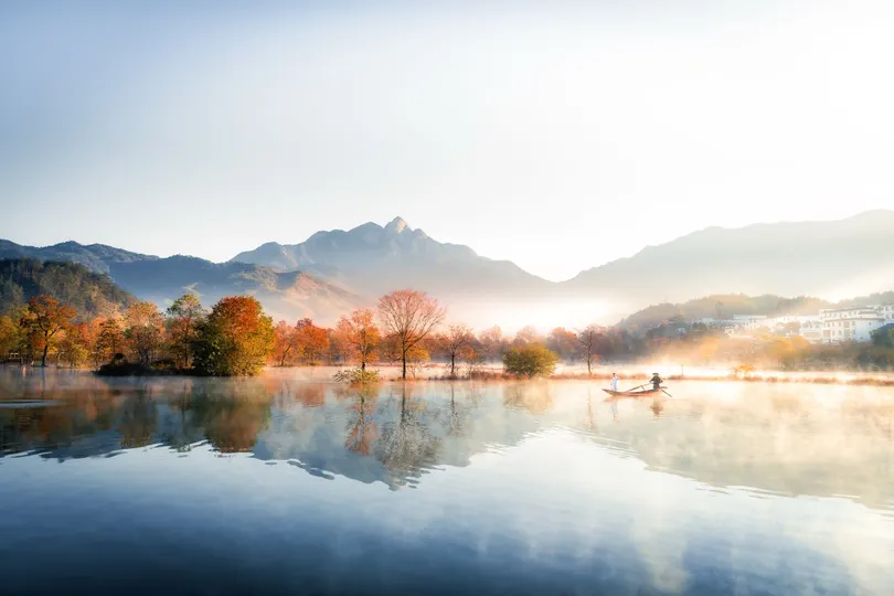 水上红叶在阳光照射下,晨雾开始慢慢散去