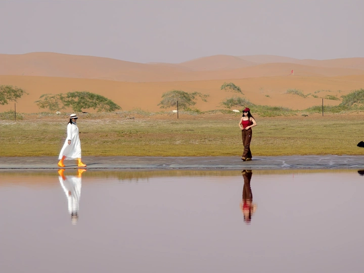 在这片广袤的沙漠中,水面如镜,倒映出人们的身影。传统服饰与现代装束在这一刻相遇,诉说着岁月的故事与当下的精彩。沙漠的宁静与人类的活力,在这片天地间完美融合,带来一种别样的视觉盛宴。