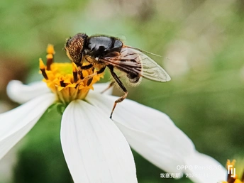 蜂蝇又名拟蜂蝇、花虻、食蚜蝇等, 是双翅目食蚜蝇科一种体表覆有绒毛的蝇类。 身体黑褐色,全身被有金黄色绒毛。腹部有光泽,具橙黄色的横带纹;翅脉多波曲,以第三纵脉的波曲最深;雄蝇的复眼在头项部左右相接近,雌蝇两眼远离;每一复眼的中部有一由绒毛形成的明显的纵带纹,头部触角的触角芒简单无分枝,但基部分布短的细毛;幼虫甚特别,身体圆筒形或椭圆形,具有似鼠尾样的长尾,比其身体长得多,往往超过体长数倍;因体型巨大,形状如蜜蜂,故称拟蜂蝇。 蜂蝇广泛分布于中国,成虫喜欢出入于花丛间,栖息于野外。产卵于污水粪坑或臭水潭中。幼虫即在污水缸,稀粪坑中孽生,其尾端有很长的呼吸管如鼠尾状,当这条长尾淹没在它正常生活的污水物中的时候,它就靠着长尾露出在大气中来呼吸。