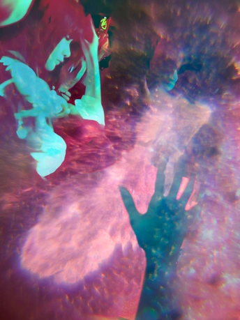 用三张照片合成完成的作品,抚摸额头的手,和她手上的烂皮,是我们人类心灵深处的反抗。