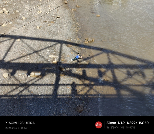 在黄河边抛石头的小孩。 强烈的阳光,明厉的阴影,凝固的瞬间。