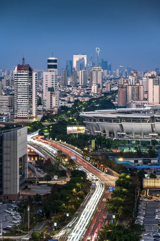 画面中央,一条繁忙的道路贯穿其中,车流如织,形成了一道道流动的光带。这些光带在夜色中尤为醒目,宛如城市的脉搏在不停地跳动。