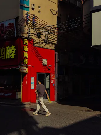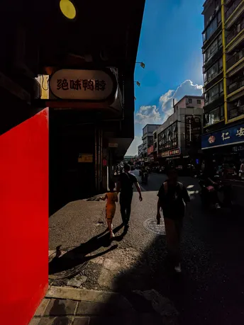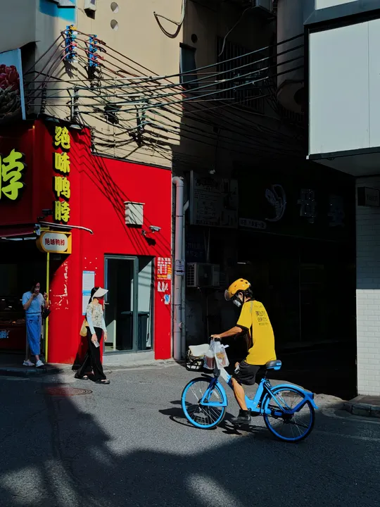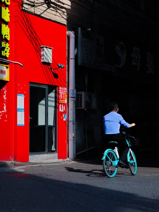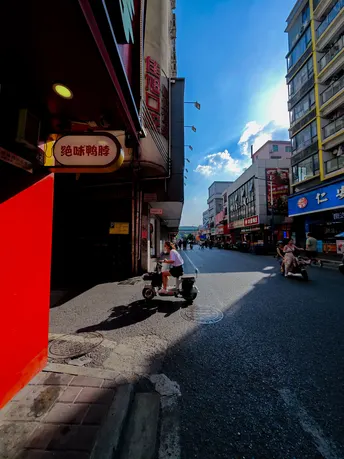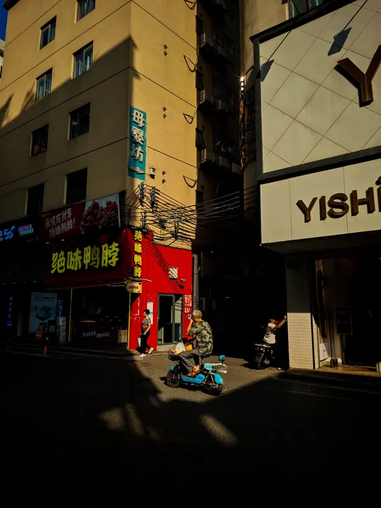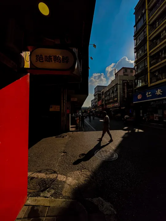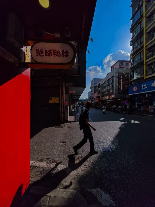 我在永泰新村追光逐影,阳光透过建筑洒向大地,形成了明暗光影。照片通过明暗对比、色彩对比生动地展现了城市街道的繁华景象与浓厚的生活氛围。在晴朗的天空下,忙碌的人们穿梭其中,传递着对美好生活的向往和追求。街道两旁,高楼错落有致,商店招牌琳琅满目,透露出浓厚的商业氛围和多样化的消费选择。这些元素共同构建了一个充满活力的城市画面,展现了现代都市的繁荣景象,无声地诉说着这座城市的故事和活力。