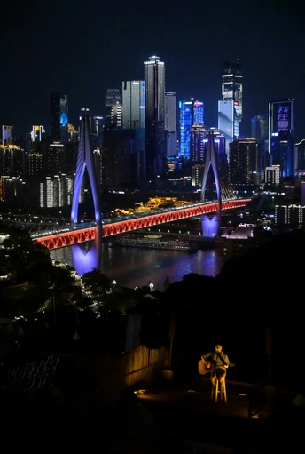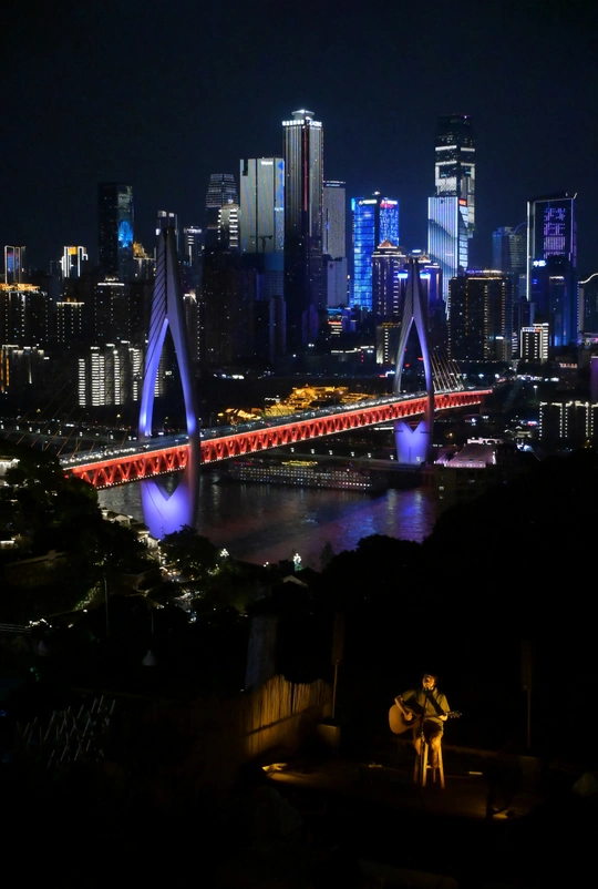 在重庆南山落日茶摊,夕阳西下夜幕降临,傍晚络绎不绝的游人散去,只留下星星点点的茶客。一把吉他,歌者开始了独自的表演,没有应和,没有掌声,但他仍然全身沉溺在尽力的表演中,背后就是山城的阑珊,小小的身影和歌声淹没在万家灯火的渝中半岛的夜色中。