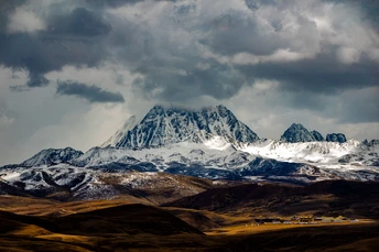 暴风雨过境后,云层隐隐和神山呼应,像是天空中倒挂的雪山,与厚重的大地平衡。阳光在翻滚的云层中穿过,洒在偶然显露出的雅拉雪山上。光影斑驳中,照亮了山脚下的寺庙,散发着一抹神性。