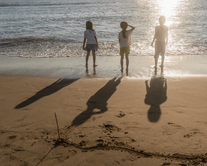 阳光下,几个孩子站在沙滩上,眺望着远方,一根竹竿静静的插在左下角,与右上角三个孩子形成鲜明的对比。