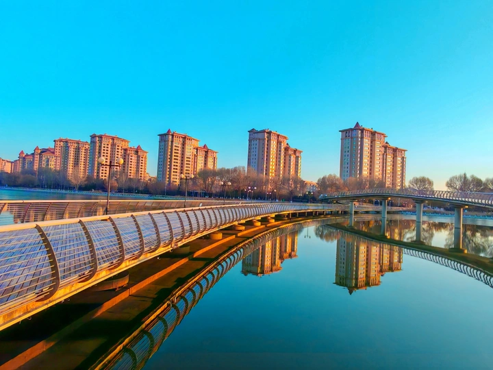魅力青城呼和浩特,市中心流淌着一条美丽的如意河,如意河上静静地架着一座彩虹桥。晨光里,与河畔楼群倒映在河面,如此的好风光。