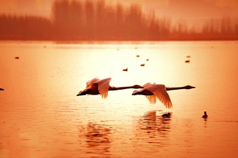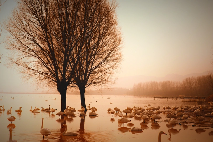 平陆三湾有一片6000公顷浩淼宽阔的湖面,入冬时节有成千上万的天鹅从西伯利亚来这里越冬
