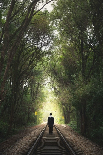 这是位于韶关的“大宝山”铁路,铁路被树木包裹着延伸到远方。