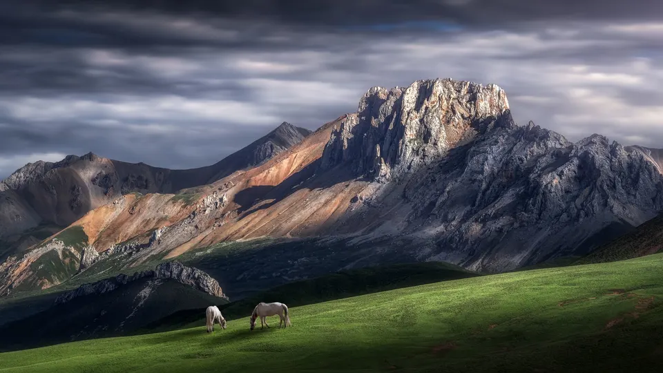 《奇山绿甸骏马闲》 从西藏回四川的国道G317途中,在夕阳温暖的抚摸下,高大的石山,柔软的草甸,两匹白色骏马悠闲地吃着草,好一幅温馨、和谐、生态的画面!