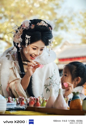 女子与小女孩的互动,让画面既有了故事感,也增加了灵动性。精致的小发饰,清澈的眼神,浅浅的微笑,皆是风情万种、清新可爱,让那份古典韵味流转于举手投足之间,令人心生怜爱,难以忘怀。