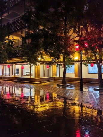 在雨中,一个城市的一个景区,灯火通明的古色古香的街道,雨水覆盖的街道里面,倒影出一个灯火的世界。