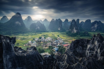 拍摄于桂林奇峰镇,在下完雨云雾慢慢散去的间隙,云层中露出了一个缝隙,阳光立马照射开来照亮了四周,奇峰得以显现它的真容。