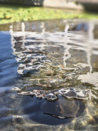 水面波光粼粼的流向荷塘