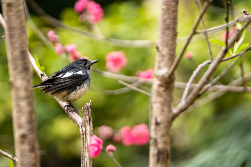 雨后在桃花林中偶遇被雨淋湿的鹊鸲