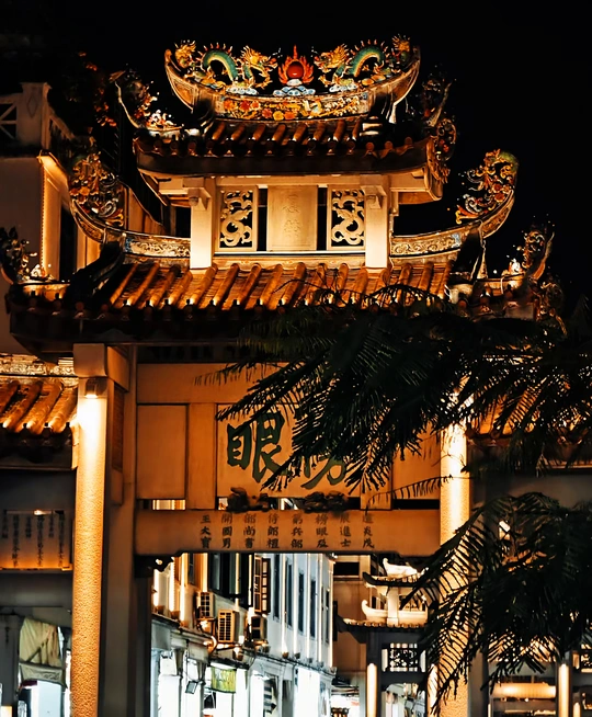 图片展示了一座夜晚被灯光照亮的传统中国建筑的局部。建筑的屋顶装饰有精美的雕刻和彩绘,包括龙和其他神话生物,这些都是中国传统建筑中常见的装饰元素,象征着吉祥和权威。屋顶的边缘向上翘起,这是中国古典建筑的典型特征。 建筑的正面有一块牌匾,上面写着“榜眼”,这可能是建筑名称的一部分或者与建筑功能相关的标识。牌匾下方有中文字符,可能是对建筑的描述或者与之相关的历史信息。 前景中可以看到一些植物的叶子,为画面增添了一些自然元素。整体来看,这座建筑可能是一个具有文化或历史意义的场所,如寺庙、宫殿或者是一个文化景点。夜晚的灯光使得建筑的细节更加突出,营造出一种庄重而神秘的氛围。