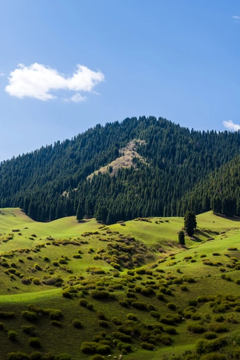 新疆的初夏,蓝天白云下的天山森林牧场郁郁葱葱,富有生机,美不胜收。