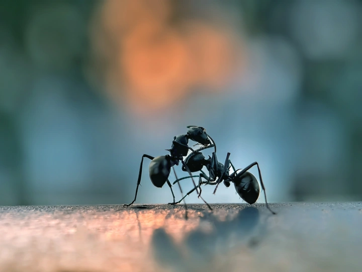 夕阳时分,两只蚂蚁在栏杆上亲密相拥,犹如相亲相爱的伙伴。