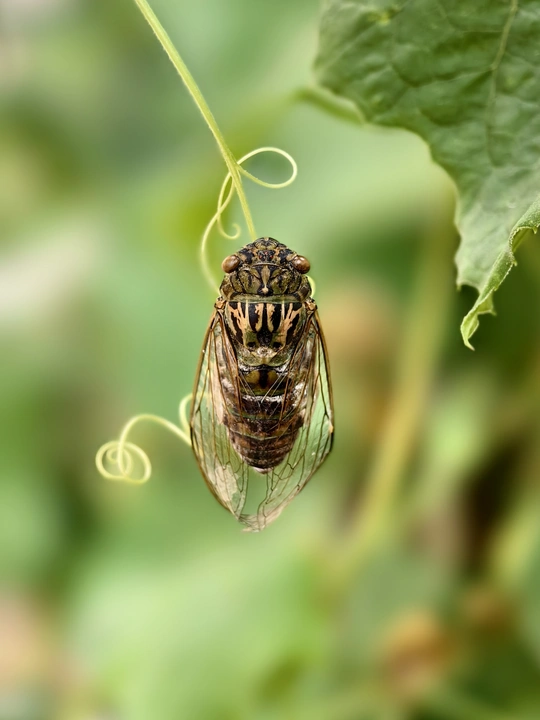 夏天的丝瓜藤蔓上拍到一只知了,知了也叫蝉。