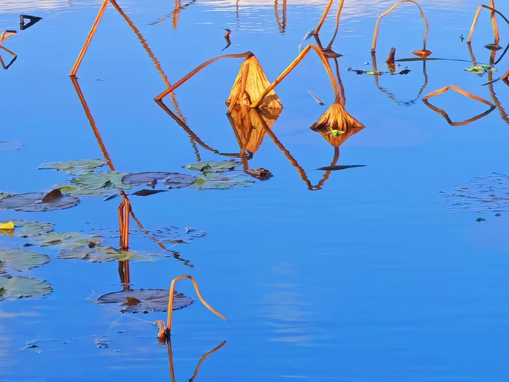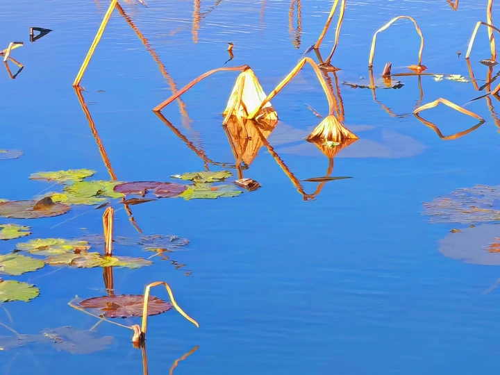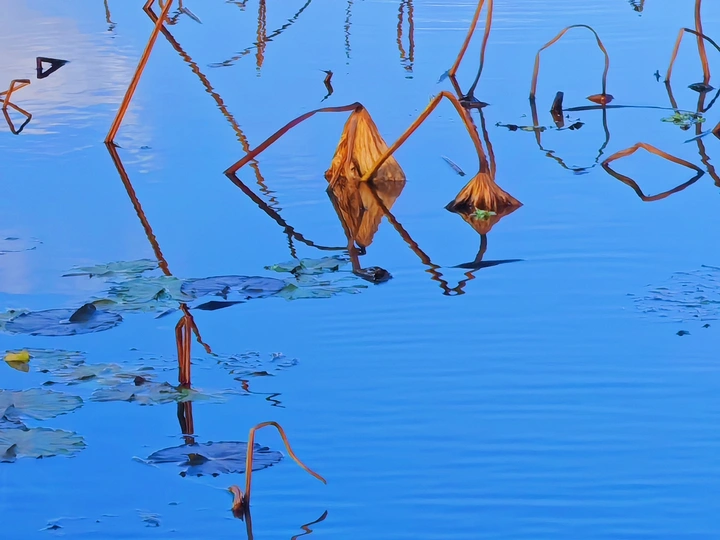 荷塘凋零荷梗的几何线条,在不同光线下的几何线条变幻之美