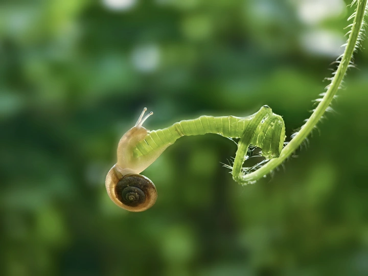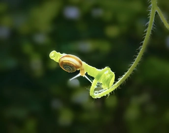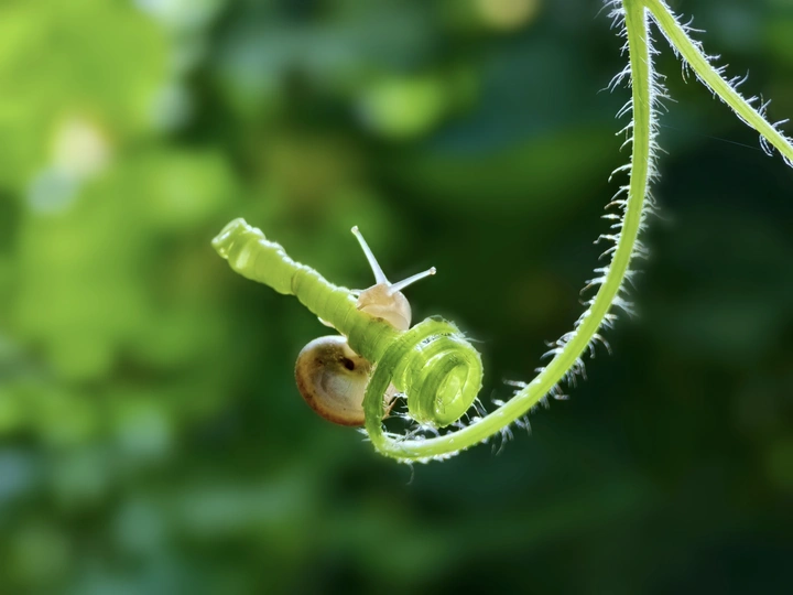 在悠长的藤蔓上,小蜗牛缓缓爬行,它轻巧的身姿仿佛是大自然最细腻的笔触,在绿意盎然的画卷上勾勒出一串串灵动的音乐画符。每一步的挪动,都像是琴弦上轻轻跳跃的音符,编织成一曲悠扬而神秘的旋律,回荡在这片生机勃勃的丛林之中