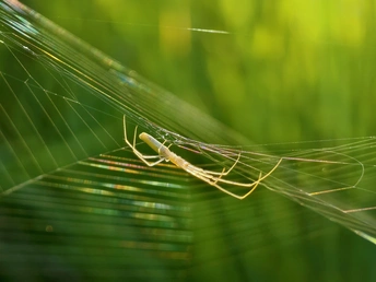 蜘蛛悠闲地在织的网上沐浴着温暖的阳光。