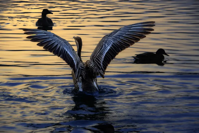夕落熔金,湖水粼粼泛光。 鸿雁展翅,向着那轮残阳。 双翅舒展,似要拥住霞光, 昂首高鸣,唱响天际苍茫。 金色光影,在湖面跳跃摇晃, 如诗画卷,晕染着暮色昏黄。 鸿雁,你是天空的行者, 此刻却与湖水共谱这辉煌。 声声长鸣,划破寂静的晚空, 那是对落日的礼赞,对天地的情长。 余晖洒落,映照着你的身姿, 定格成这绝美,难忘的景况。
