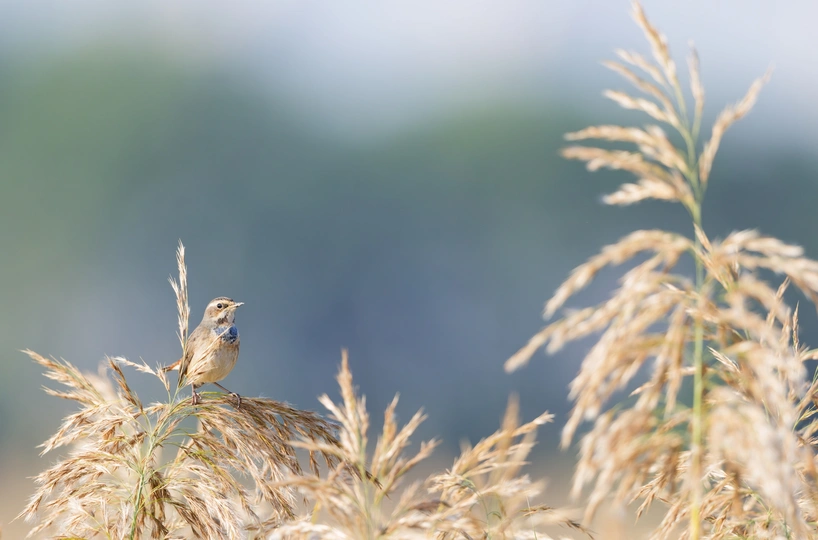 现在芦苇枝头上的蓝喉歌鸲气质出众