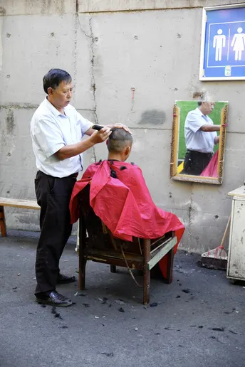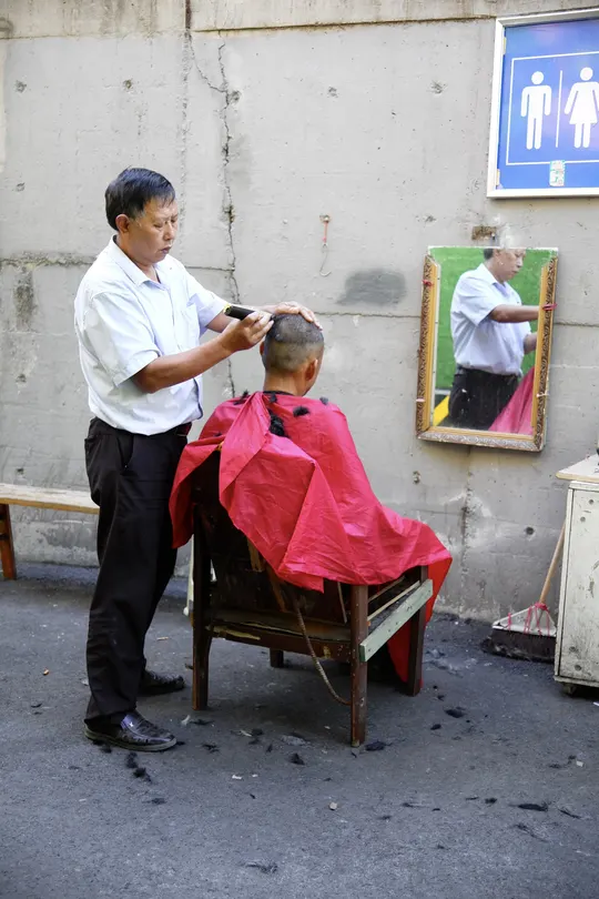 成都华阳老街边,一个老式的理发瘫。红色的布,绿色的背后围挡,蓝色的标志,三原色就这么集齐了。理发师傅专注的表情。时光仿佛回到了以前。