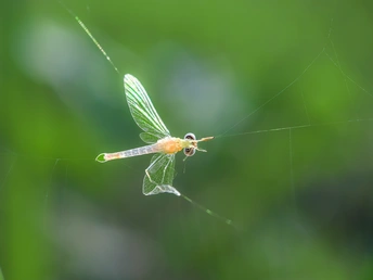 一只蜉蝣被蜘蛛网困住,展开翅膀犹如一架飞行的飞机。