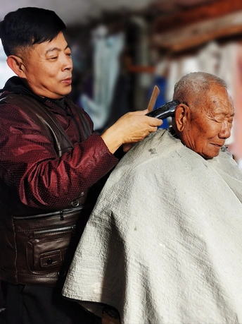 我去理发时,看到理发师正在为一老人理发,闲聊中得知这位老人已经95岁了,性格开朗,身体倍棒,生活能自理,每次理发也不用家人陪同,我用手机拍下了这张照片。