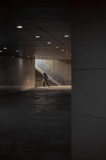 地下通道的昏暗,被那缕倔强挤进来的阳光撕开一角。行人逆着阴影,沿着梯子攀爬,向着光,奔赴一场生活的破茧。